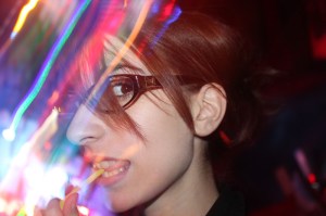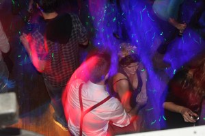 De mon côté j’avais opté pour une silhouette atypique, donc: jupe en tweed et top en latex. Complété par une paire de bas nylons Les Nylons d’Oliv, et ems fidèles Louboutin. Forcément, quand on porte un top noir et rouge on porte des chaussures rouges et noires. L’idée était moyennement lumineuse celà dit, danser sur 12cm de talons c’est faisable mais crevant, à la fin j’en avais quand même un peu marre. mais je n’ai pas faillis, qu’on se le dise. MademoiselleCherie reste MademoiselleCherie. Il y a bien une caméra qui est restée braquée sur Jordan, marie-Odile (ma soeur), Thierry (qui la faisait danser) et moi quand on était sur la piste mais je ne sais pas qui étais derrière, et donc je serai incapable de récupérer une quelconque image, et malheureusement je n’ai pas souvenir qu’aucun photographe ne se soit dirigé vers moi. Heureusement il reste les copains, merci à JM pour cette jolie image.