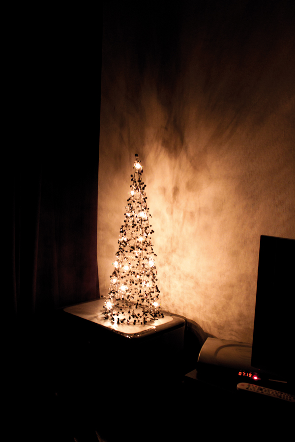 J’avais envie de partager avec vous une petite photo de mon sapin, que je trouve trop joli. Alors j’entends déjà les puristes crier au loup mais franchement un vrais sapin c’est super compliqué, ca rends le chat a moitié dingue, ca perds ses épines, c’est un coup a se faire cogner par ses copains amis des arbres si on en a, enfin ca ne va pas. J’ai donc craqué pour cette version baroque du sapin de noel: la structure métallique décorée de pampilles noires, qui brille dans le noir.