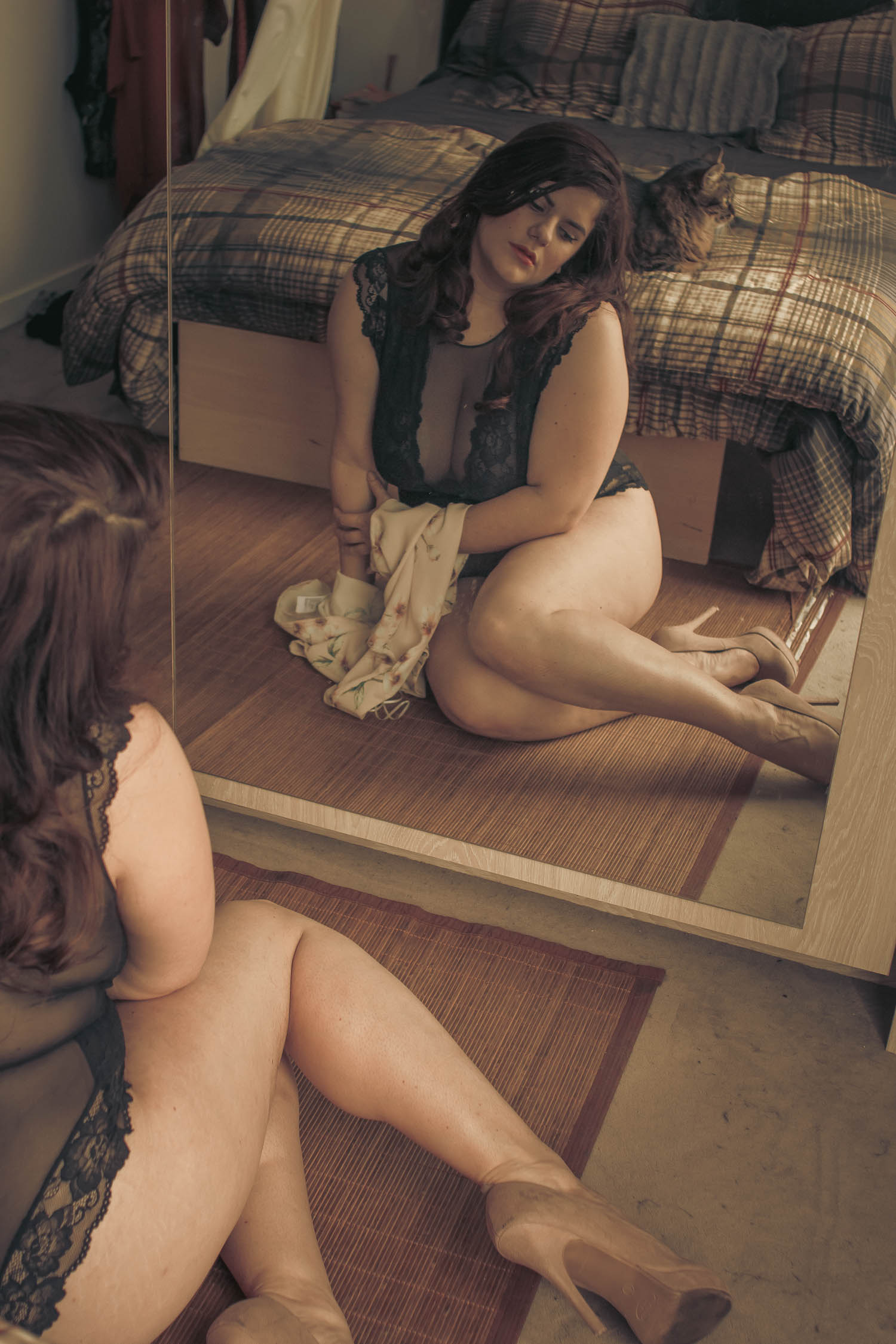 Concrètement, ça veut dire que des espaces limités pour poser mes lumières et mon trepied, et plus de contraintes au niveau des poses qui doivent être réussies face camera, mais aussi dans mon reflet. Un gros bonus au niveau de la mise au point par contre, que j’ai pu faire dans le miroir et pour ainsi dire oublier pendant tout le reste de la séance (sauf quelques rares exceptions ou j’ai décidé de faire la focale sur le modèle vivant et pas sur son reflet).