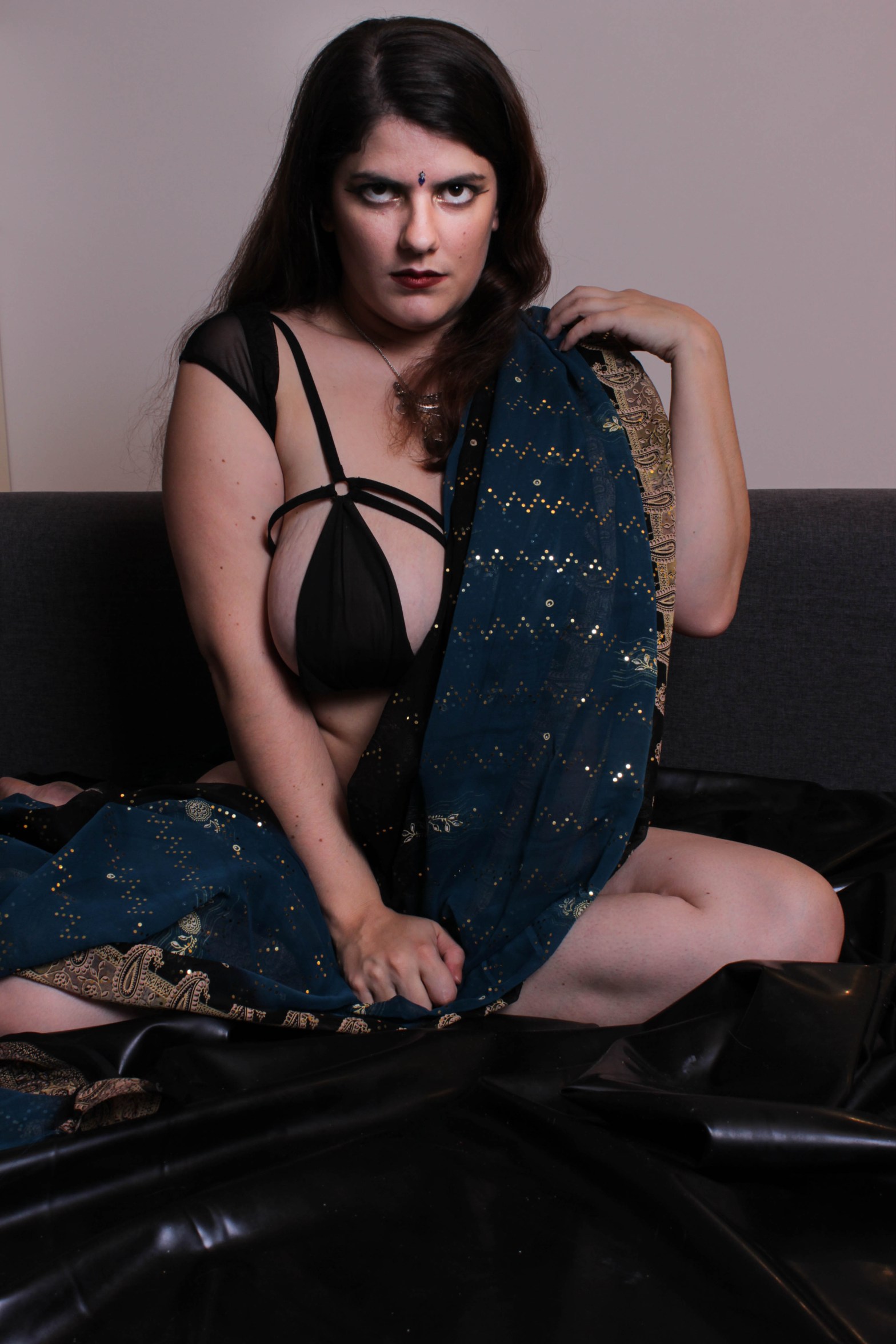 Sauf que bon le full nu sur un shoot en plongée, ça fait vide baleine échouée, aussi j’ai été choisir une jolie lingerie. Et puis ma coloc m’a donné la bonne idée d’accrocher de la mousseline noire à mon harnais pour préserver ma pudeur. Là j’ai subitement eu envie de partir sur un make up assez dramatique qui rappelle le look des mariages indiens, elle a sorti le joli voile bleu que vous voyez là, et avant que je comprenne je me suis mis à shooter une espèce de déesse séductrice et bleu nuit. une version Bollywood de Nout, la déesse égyptienne de la nuit.